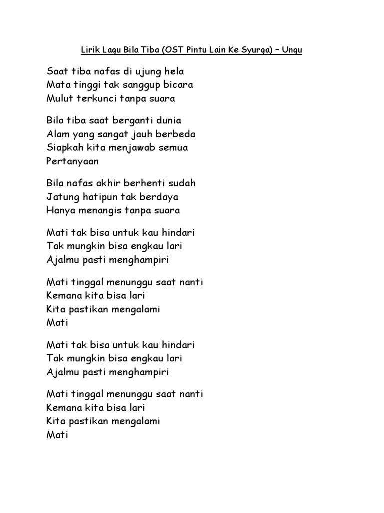 Bila Tiba - Ungu. Alam yang sangat jauh berbeda. Mati tak bisa untuk kau hindari C F Tak mungkin bisa engkau lari Dm E Ajalmu pasti menghampiri Am Dm G Mati tinggal menunggu saat nanti C F Kemana kita bisa lari.